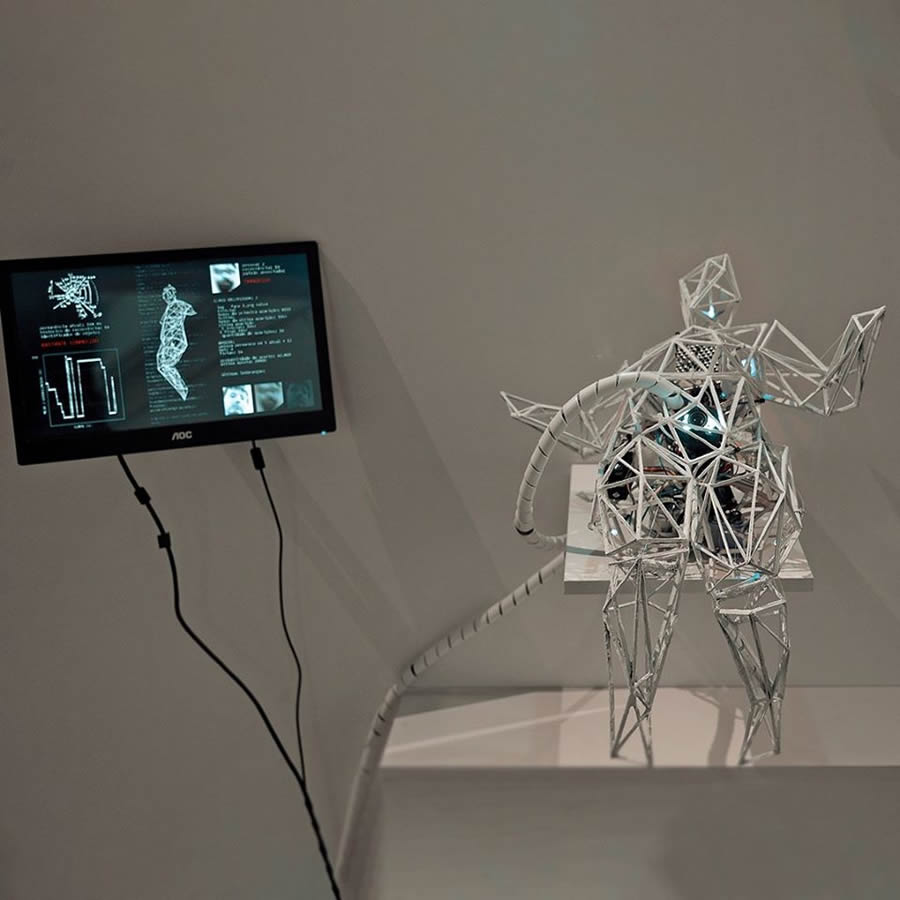 Em busca de entender os primórdios da consciência biológica o artista usa poesia e semiótica para apresentar pequenos robôs antropomórficos e autômatos que percebem o ambiente através dos seus sensores e responde o mundo concreto com movimentos e sons.