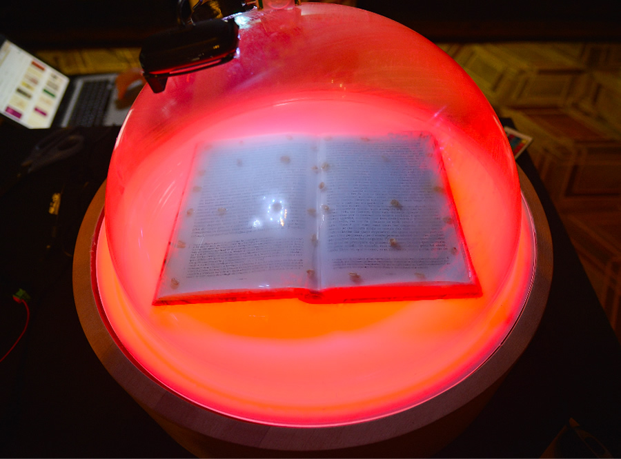Nesta rede “biohíbrida” (digital e biológica), livros físicos que documentam o desejo humano de controlar e remodelar a natureza servem de alimento para uma colônia de fungos vivos. Ao lado do livro com os microorganismos, há um monitor de computador onde se vê a ação de um fungo digital inteligente, que procura na internet e corrompe textos com o mesmo intuito predatório encontrado no livro.