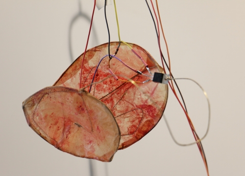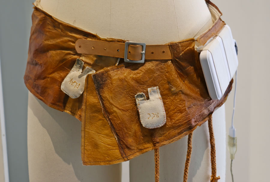 dados e obter um “sexto sentido” sobre seu corpo e seu contexto, transformando a pele em uma interface para experimentação de dados. Esses trabalhos buscam explorar possíveis futuras peles-vestimentas, mais adaptáveis aos modos de ser contemporâneo, aos fluxos de informações e ao corpo em movimento. Trata-se de tecidos construídos por processos biológicos naturais, mas também técnicos.
